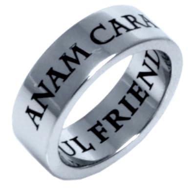 High quality stainless steel ring etched with Celtic text "Anam Cara" (top) and "Soul Friend" (inside). Hypo-allergenic.